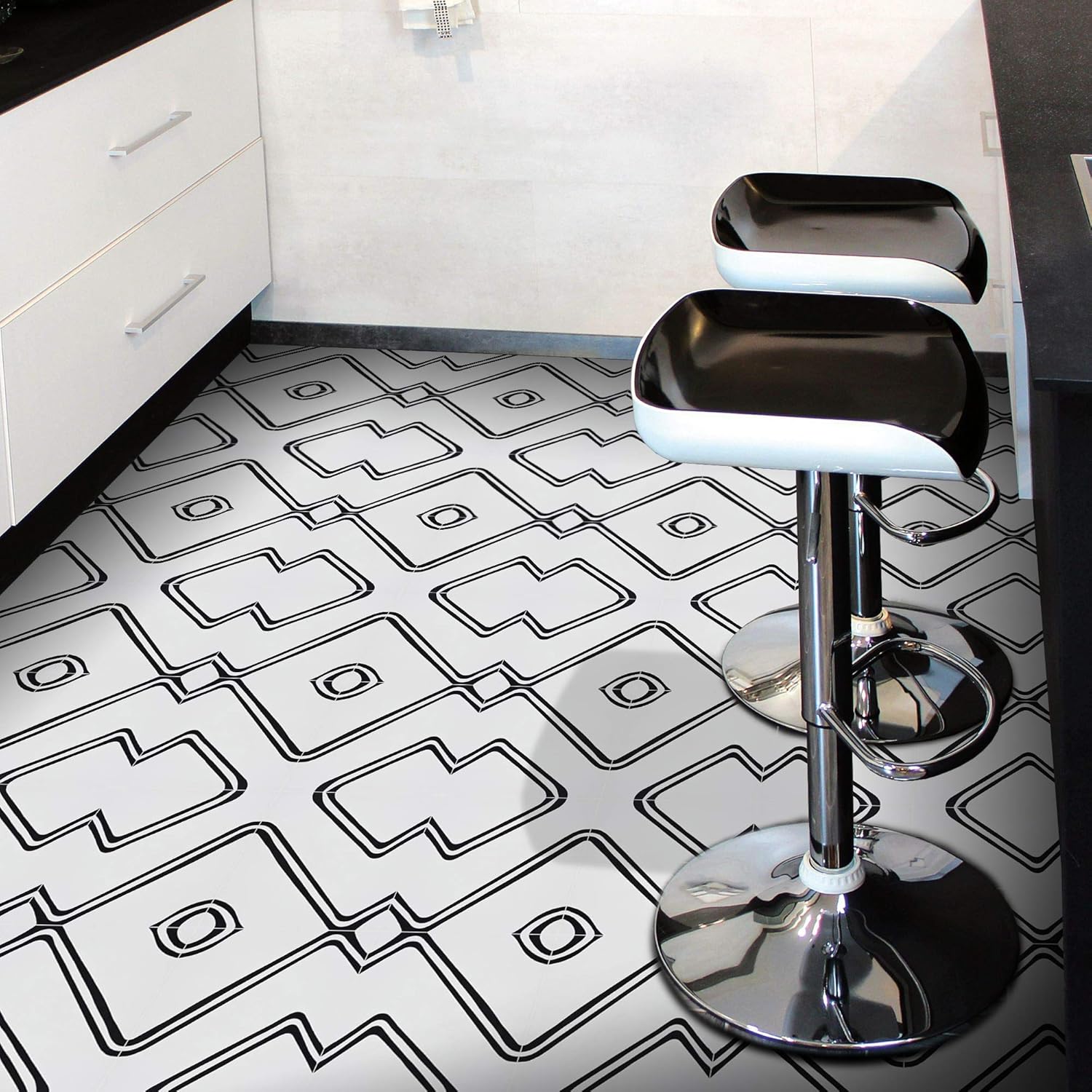 The monochromatic, moroccan floor tile she installed took the newly renovated space to a new chic level.